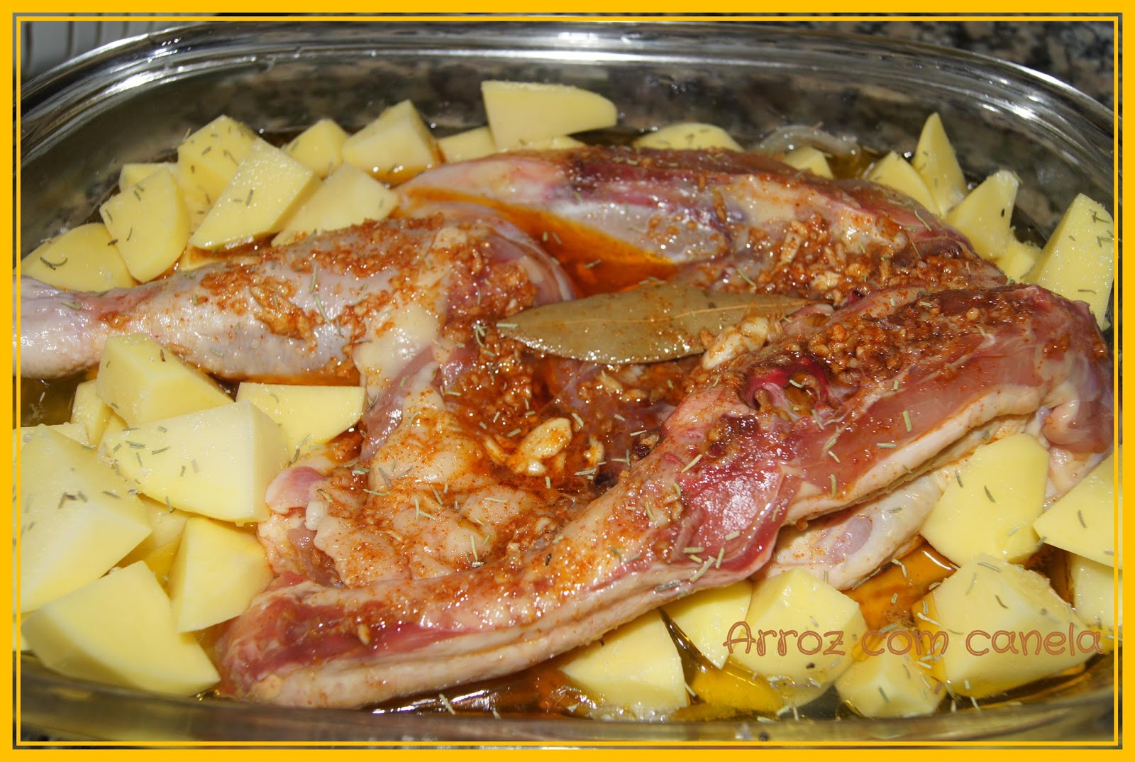 Com um esmagador de alhos pise os alhos para uma taça com o azeite, acrescente o colorau, o sal, a folha de louro e misture bem. Barre o frango com esta mistura, pelo menos 1 a 2 horas antes de ir ao forno. Na altura de levar ao forno coloque um pouco de azeite num pirex ou tabuleiro e cubra o fundo com as rodelas de cebola. De seguida disponha no tabuleiro o frango e as batatas. Acrescente o vinho e a água e salpique com uma pitada de sal e com o alecrim a gosto. Leve ao forno pré-aquecido a 200º durante 50m. A meio do tempo vire as batatas e o frango, colocando a pele para cima. Sirva com arroz branco e uma salada.
