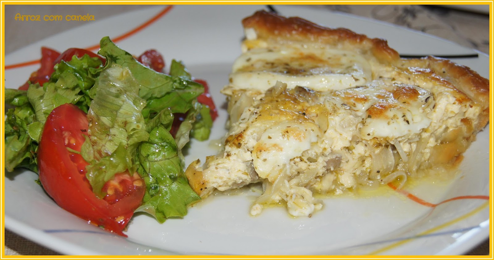 Estenda a massa folhada e forre com ela uma tarteira aproveitando o papel vegetal e pique o fundo com um garfo. Corte as cebolas às meias luas fininhas (eu uso um cortador de legumes ou mandolina) e leve a refogar com o azeite. Adicione o alho-francês cortado em rodelas finas e os cogumelos cortados em quartos. Acrescente o bacon em cubos. Tempere com sal, a pimenta moída na hora, orégãos e salteie. Retire do lume e coloque na tarteira.