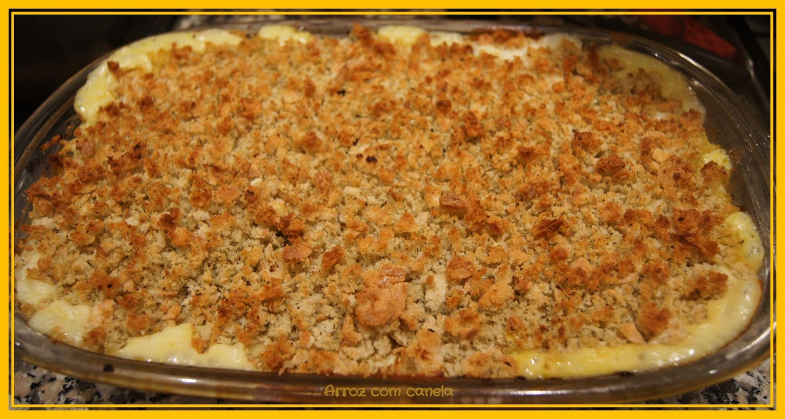 Sem lavar o copo, coloque todos os ingredientes do bechamel, exceto as natas e programe 8m/90º/4. No final deste tempo acrescente as natas e programe 2m/90º/4. Deite por cima do preparado e envolva. Espalhe por cima o pão ralado e leve ao forno cerca de 15 minutos ou até alourar.