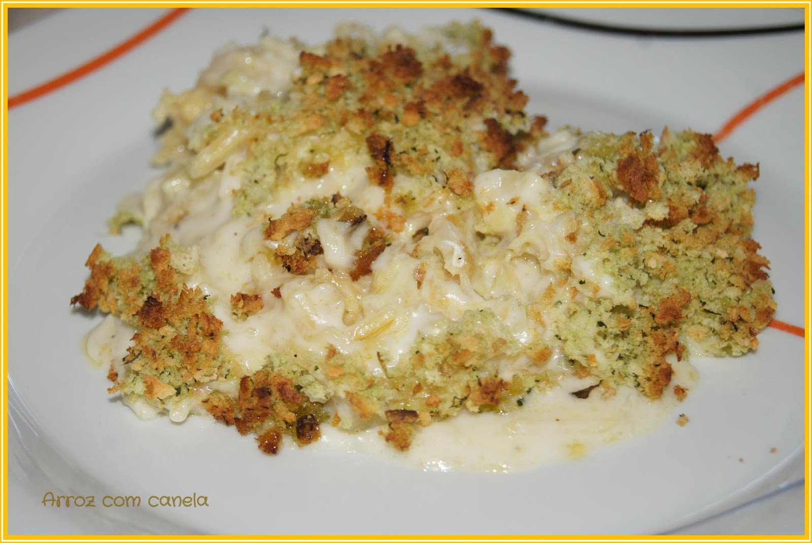 Para o bechamel, coloque a manteiga num tacho, deixe derreter, junte-lhe a farinha e mexa bem. Sempre em lume brando vá acrescentando o leite morno, em fio, mexendo sempre com a vara de arames. Tempere com sal, pimenta e noz-moscada a gosto e deixe cozer em lume brando durante cerca de 6 minutos. No final deste tempo acrescente as natas e deixe cozinhar mais 2/3 minutos. Deite por cima do preparado e envolva. Espalhe por cima o pão ralado e leve ao forno cerca de 15 minutos ou até alourar.