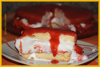 Bolo de chocolate: Pré-aqueça o forno a 180º. Coloque no copo o cacau, a manteiga, o óleo, a água e programe 8m/90º/1. Adicione o açúcar e a farinha e programe 2m/3. Numa taça bata os ovos, junte o leite, o bicarbonato de sódio, a baunilha e coloque no copo envolvendo durante 1m/3. Coloque numa forma untada e polvilhada com farinha e leve ao forno cerca de 40m ou até que um palito inserido no centro do bolo saia seco. Retire e deixe arrefecer 10 minutos antes de desenformar. Faça este procedimente duas vezes de modo a ficar com dois bolos. Coloque o primeiro bolo no prato de servir. Corte o segundo bolo de modo a que fique com um diâmetro inferior ao primeiro e coloque-o por cima deste.