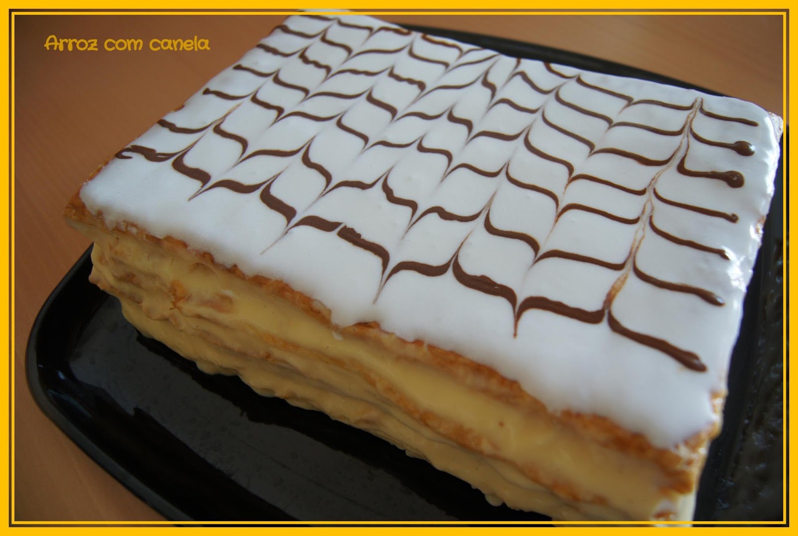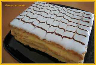 Pré-aqueça o forno a 180ºC. Corte as massas folhadas ao meio, no sentido que preferir (fica bem das duas maneiras) com um cortador de pizas ou com uma faca afiada, deixe em cima do papel vegetal e coloque no tabuleiro do forno. As massas podem ir todas ao mesmo tempo, em 2 tabuleiros. Tem que se ter o cuidado de as picar com um garfo quando estiverem a levantar. Levar ao forno durante 12 a 15 minutos, até ficarem douradas.Numa tigela misture os ovos com o açúcar, a maizena e a farinha custard com um batedor de claras. Aqueça o leite num tacho e junte este preparado ao leite quente, mexendo sem parar até engrossar. Junte a manteiga e mexa bem até obter um creme espesso e liso. Coloque num recipiente e deixe arrefecer mexendo de vez em quando para não solidificar.Para fazer o glacé, coloque a clara numa taça e bata com ajuda de um garfo. Quando começar a ficar esbranquiçada, vá adicionando o açúcar em pó progressivamente, colher a colher sem parar de mexer com o garfo. (Não sei ao certo a quantidade de açúcar que utilizei, fui pondo a olho.) Adicione açúcar, até notar que o glacé tem boa consistência. Reserve.Para fazer as riscas, retire para um recipiente pequeno, 1 colher de sopa de glacé e junte o chocolate em pó, misture bem. Coloque num saco plástico pequeno cortando o bico (eu uso os sacos das sandes) ou num saco de pasteleiro com o bico simples. Reserve.Para fazer a montagem do mil-folhas, coloque por camadas a massa folhada virada ao contrário para que fique com a parte mais lisa em cima e barre com o creme de pasteleiro. Coloque a última camada de massa folhada e barre as laterais com o creme que restar. Com ajuda de uma espátula espalhe em cima o glacé que deverá cobrir toda a superfície da massa folhada. De seguida com o creme de chocolate, faça riscas no sentido do maior comprimento. Por fim, com ajuda de um palito, arraste-o levemente por cima da massa, no sentido no menor comprimento, uma vez para um lado, outra vez para o outro. O que lhe dará a sua configuração habitual.